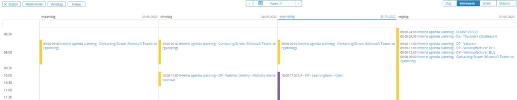 Interne agendaplanning: Wanneer dit type gekoppeld is aan je agenda item (verzoek) wil dit zeggen dat het verzoek afkomstig (en dus geboekt) is vanuit Outlook. Dit type gebruiken we niet om te plannen in Synergy. Dit type agenda item heeft een gele kleur in de Synergy kalender.