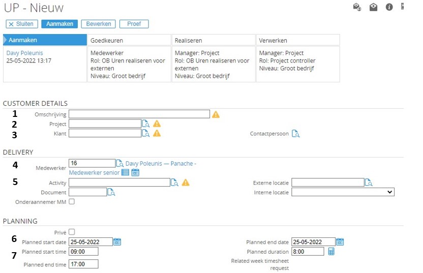 Om te plannen in Synergy gebruik je steeds het type UP (Urenplanning). Bij het plannen zijn er een aantal velden die dienen ingevuld te worden.
